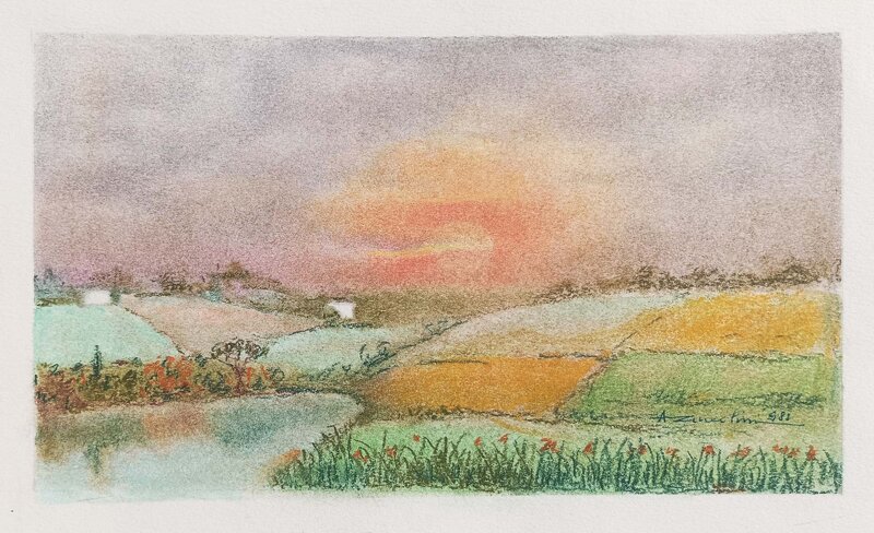 I campi sono trattati come tasselli (verde, ocra, beige, azzurro pallido). Una mappa “semplice” e molto efficace: sembra quasi un patchwork rurale. Una fascia scura di alberi tiene insieme la composizione e dà profondità, senza rubare la scena al cielo. L'erba e i piccoli papaveri rossi sono il contrappunto narrativo, il “battito” vicino allo spettatore.