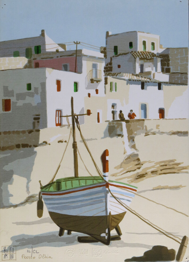 "Presso Olbia" è un paesaggio assolato ispirato dai posti e dalla luce mediterranea della Sardegna, realizzato con la tavolozza di colori caratteristici e distintivi del pittore Aldo Riso.