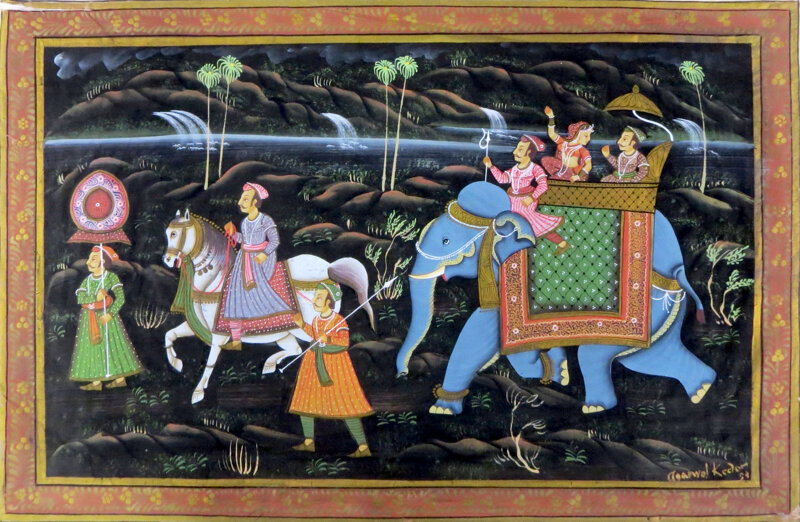 Aviral Kedar reinterpreta il corteo reale attraverso una composizione teatrale e rituale. L’elefante bardato, simbolo di potere e sacralità, domina la scena, trasportando dignitari tra figure cerimoniali e servitori. L’artista impiega una tavolozza satura e luminosa, in cui l'azzurro acceso dell’elefante e i rossi ornamentali creano un equilibrio cromatico vibrante. La precisione nei dettagli decorativi – dai turbanti ai tessuti ricamati – testimonia la perizia pittorica di Kedar e il suo profondo legame con l’estetica classica indiana. Datata 1993, l’opera conserva intatto lo spirito narrativo delle pitture di corte, ma rivisitato con libertà stilistica e sensibilità contemporanea. È un omaggio alla ritualità regale, ma anche alla memoria collettiva che sopravvive nei gesti e nei simboli.