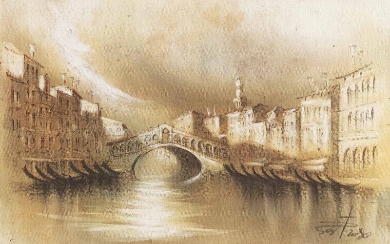 Suggestivo olio su tela, con alba sul Canal Grande, con Ponte di Rialto. Atmosfera invernale, nebbiosa. La città dorme ancora, e nulla si muove sulle banchine e sul Canal Grande. Solo le gondole ormeggiate, stilizzate ad arco, inseriscono un prezioso elemento di dinamismo nella composizione. Composizione raffinata.