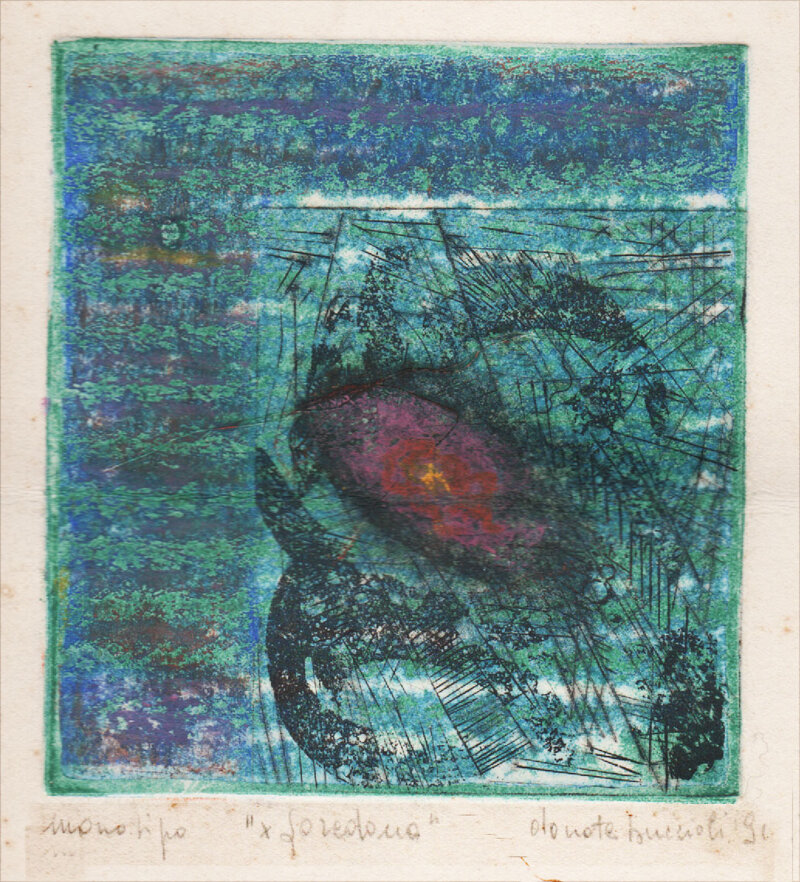 Donata Buccioli, è un'artista attiva a Roma e nel Lazio, con mostre collettive e progetti culturali molto originali e creativi. L'opera proposta è un monotipo di acquaforte, acquatinta e pastelli e presenta vari testi e una dedica personale. Il monotipo è una stampa, tirata in un unico esemplare: l'artista stende l'inchiostro calcografico e dipinge direttamente sulla lastra metallica che, nel torchio, la trasmette su un foglio.