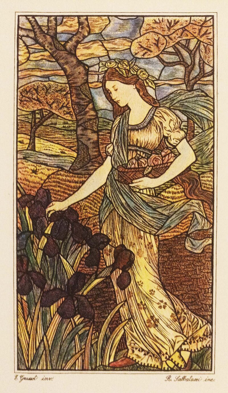 Soggetto: una giovane donna, allegoria della natura e della femminilità, avanza in un paesaggio stilizzato raccogliendo fiori scuri di iris. La composizione è costruita su una linea continua e decorativa, con campiture cromatiche compatte e un ritmo verticale che richiama arazzi e vetrate medievali. Un esempio emblematico del linguaggio Art Nouveau di fine Ottocento, dove figura umana e natura si fondono in un’armonia simbolica e senza tempo.