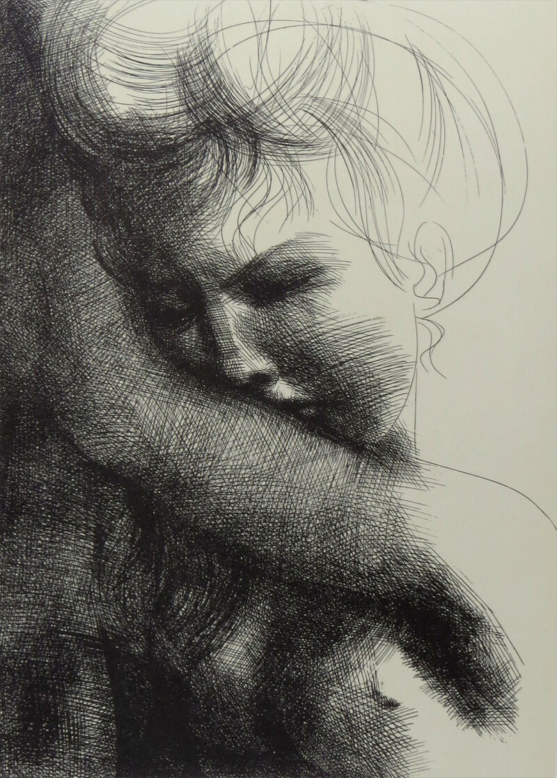 Nelle grafiche di Emilio Greco, le giovani si offrono allo sguardo come in un gioco d'ombre. I corpi non sono mai esibiti: sono presenze raccolte, spesso col capo chino, le spalle curve, le mani unite. La linea, precisa e leggera, modella un corpo che è idea e memoria, non esibizione. Queste figure non parlano: si ascoltano.