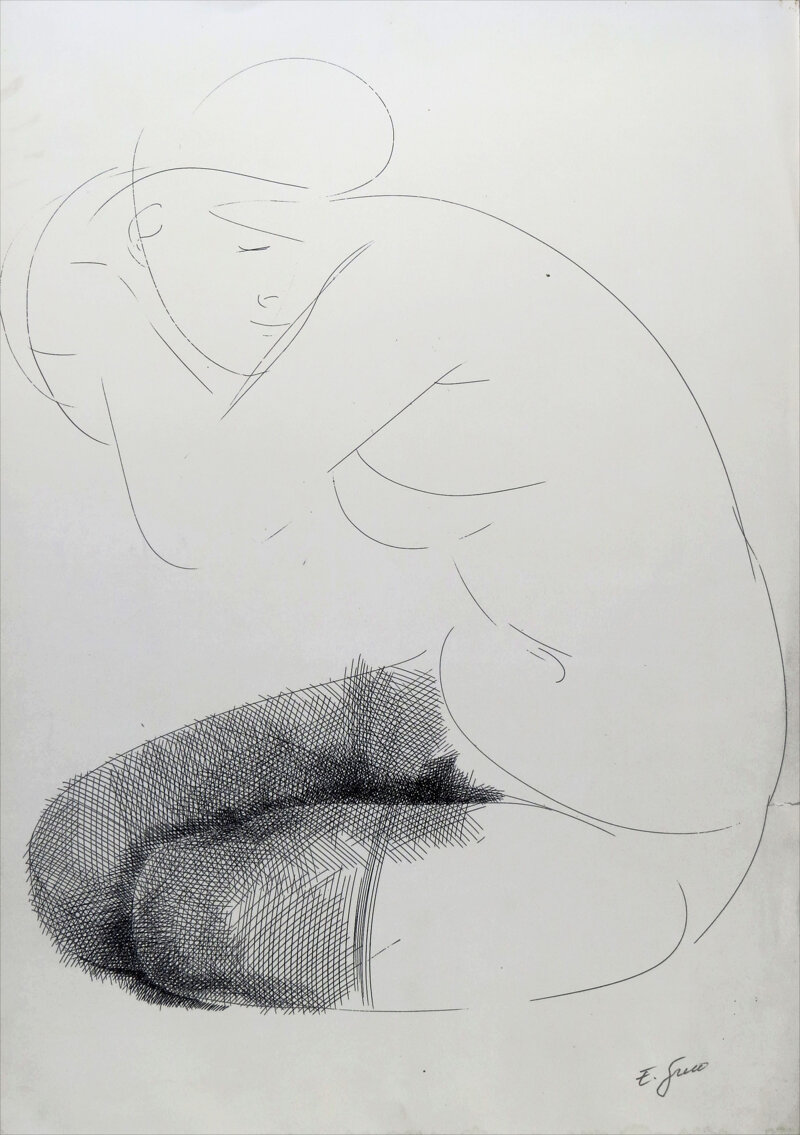 Nelle grafiche di Emilio Greco, le giovani si offrono allo sguardo come in un gioco d'ombre. I corpi non sono mai esibiti: sono presenze raccolte, spesso col capo chino, le spalle curve, le mani unite. La linea, precisa e leggera, modella un corpo che è idea e memoria, non esibizione. Queste figure non parlano: si ascoltano.