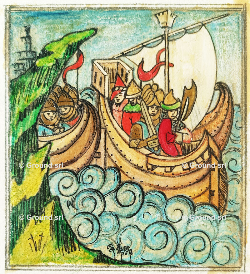 miniatura moderna, ispirata ai codici illustrati del tardo Medioevo, rielabora con sensibilità contemporanea l’immaginario marittimo mediterraneo.