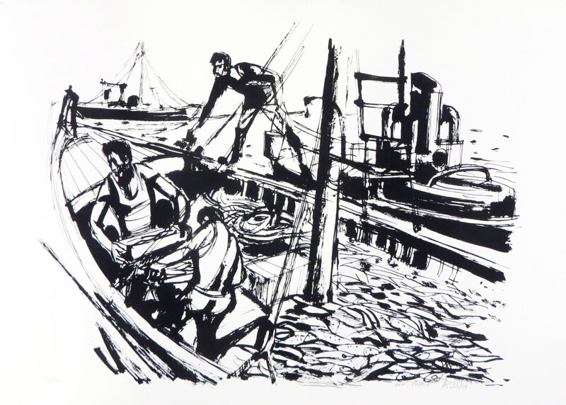 Manfredo Acerbo, intensa nella sua essenzialità formale, è un omaggio silenzioso ai piccoli pescatori del porto-canale di Pescara, città natale dell’artista e patria di Gabriele d’Annunzio. L’opera restituisce, con pochi segni e toni misurati, la dignità umile del lavoro quotidiano (la consegna al molo del pescato) e l’identità di un luogo sospeso tra mare e fiume.
