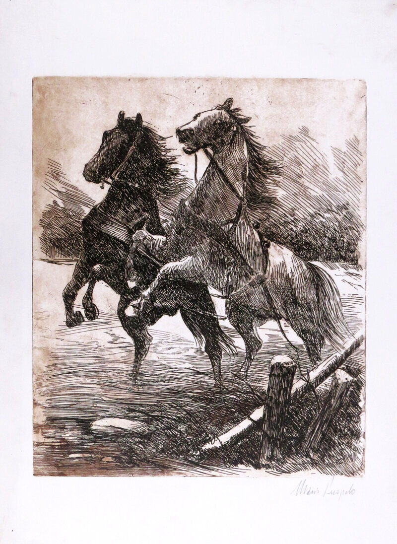 Mario Puopolo, artista romano distintosi nel secondo dopoguerra. L'opera rappresenta con rara efficacia due cavalli che, spaventati dalla tempesta, rompono i finimenti.