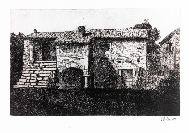 soggetto è una casa rurale in pietra, tipica dell’Italia centrale, resa con un segno preciso ma al tempo stesso caldo. Le scale, l’arco, il tetto in coppi e il gioco delle ombre restituiscono una scena di grande atmosfera e memoria.